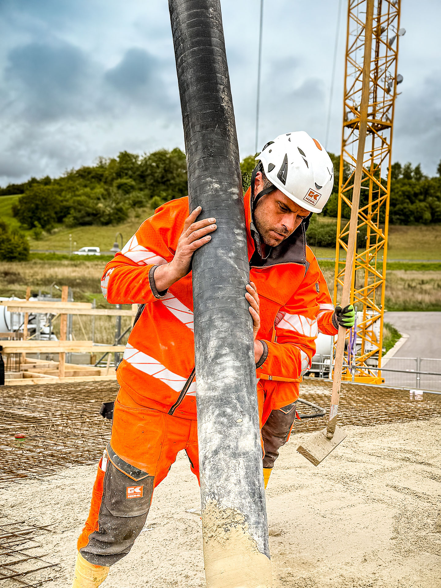 Mitarbeiter führt Betonarbeiten auf einer Baustelle aus und hält einen Betonschlauch